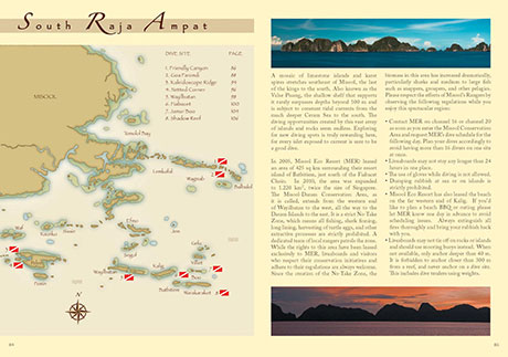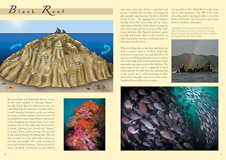 Dive sites are grouped into North, South and Central areas of the archipelago, all supported with situation maps for clearer orientation. Every dive site is elegantly presented in a double-spread, including 3D maps, spectacular pictures of the area and insightful information on how to safely make the most of every dive.